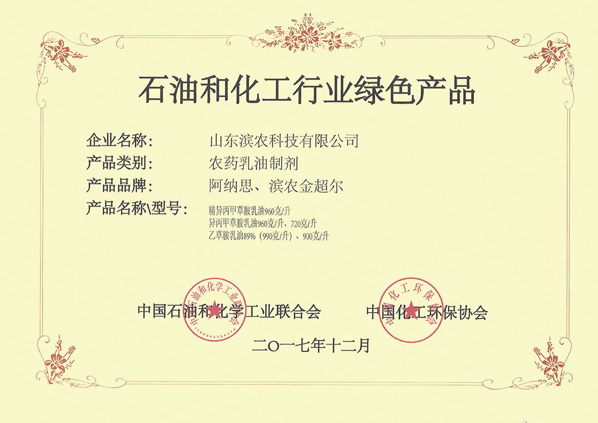 12月14日,由中國(guó)石油和化學(xué)工業(yè)聯(lián)合會(huì)和中國(guó)化工環(huán)保協(xié)會(huì)主辦的“2017年石油和化工行業(yè)綠色發(fā)展大會(huì)”在北京隆重召開(kāi),山東濱農(nóng)科技有限公司農(nóng)藥乳油制劑 “960 克/升精異丙甲草胺乳油”“960 克/升、720 克/升異丙甲草胺乳油”“89%(990 克/升)、900 克/升乙草胺乳油”等產(chǎn)品被認(rèn)定為“石油和化工行業(yè)綠色產(chǎn)品”并獲頒證書(shū)。