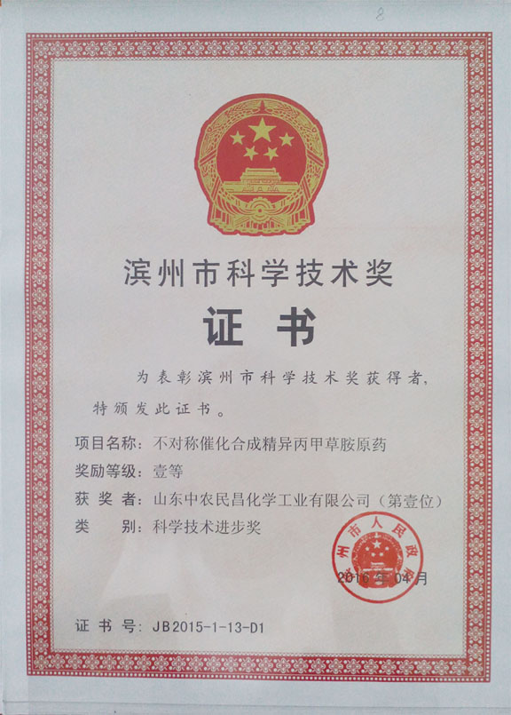山東中農民昌化學工業有限公司“不對稱催化合成精異丙甲草胺原藥”和“磺草酮·莠去津懸浮劑的開發及產業化”項目分別獲得濱州市科學技術進步獎一等獎和三等獎,山東濱農科技有限公司“新型油菜田除草劑二氯吡啶酸·烯草酮WP的開發研制”項目獲得濱州市科學技術進步獎三等獎。